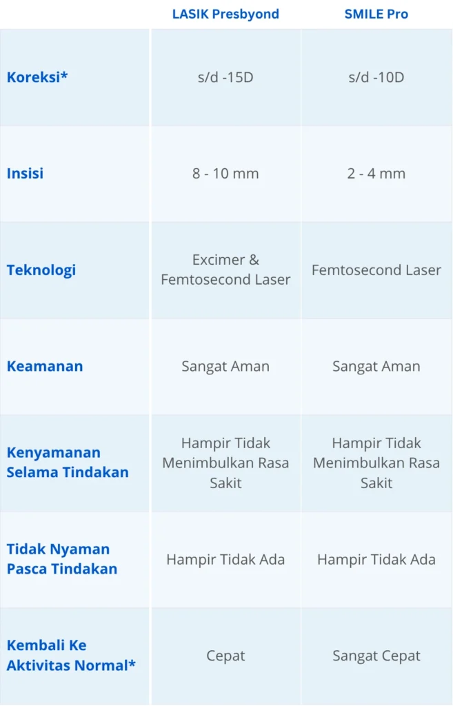 Secara umum, SMILE PRO adalah opsi Koreksi Penglihatan Laser yang kurang invasif dan memiliki risiko yang kecil untuk mengalami infeksi pasca-bedah atau sindrom mata kering sementara. LASIK menawarkan waktu pemulihan visual pasca-prosedur yang sedikit lebih cepat. Berdasarkan kesalahan refraktif, kondisi mata, dan anatomi, ahli bedah Anda dapat merekomendasikan perawatan yang tepat untuk Anda!